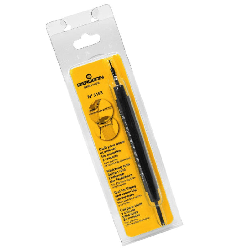 The Bergeon 3153 Spring Bar Tool is a professional-quality watchmaking tool designed for precise strap and bracelet work. It features a Ø0.80 mm pin and a 3 mm wide fork, paired with a hexagonal black bakelite handle for a secure, comfortable grip. The shaft includes a millimetre gauge for added accuracy, and the tool measures 150 mm in length—trusted by watchmakers worldwide for reliable spring bar fitting and removal.