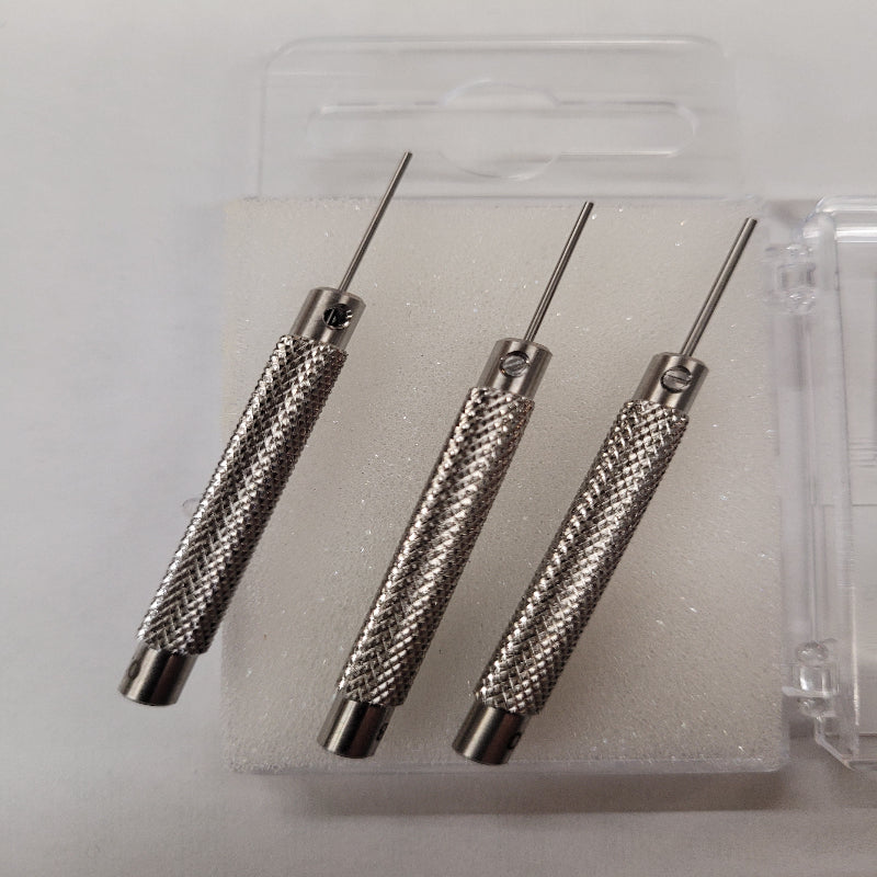 Effortlessly remove bracelet pins with this professional-grade tool set. With 3 pieces in a convenient plastic box, the diameters of 0.80mm, 0.90mm, and 1.00mm are perfect for a variety of bracelet sizes. The chromed brass handles and hardened steel tips ensure durability and precision, with a working length of 15mm.