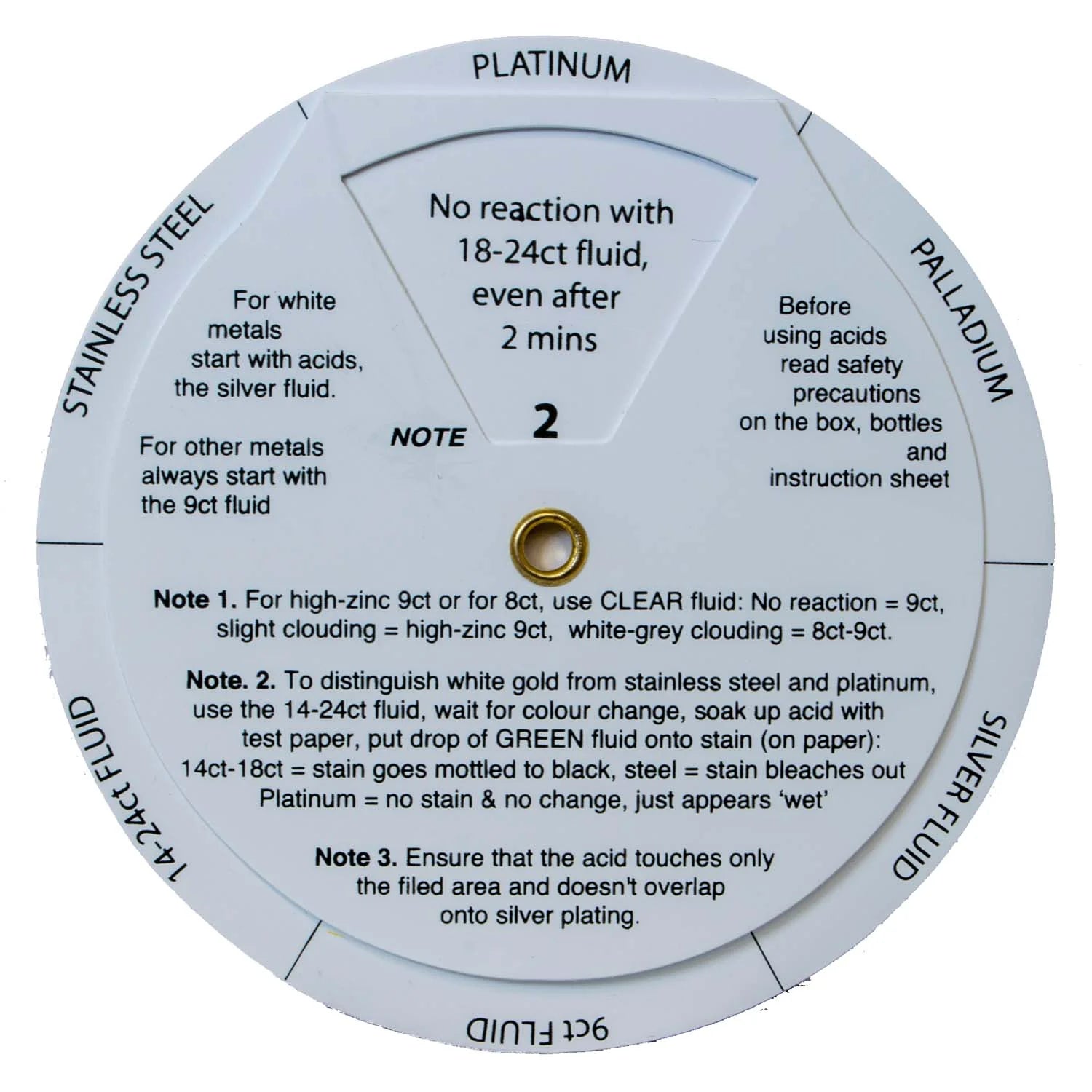 Turn the disc to see, in the windows, the various reactions of the acids. This must be used in conjunction with with the instruction sheet (included). For the Troytest kits.