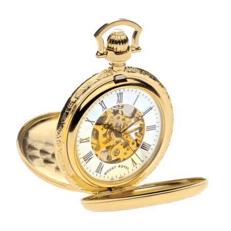 This Mount Royal Skeleton Pocket Watch is presented within a gold plated case. The watch features a 17 jewelled mechanical movement and classic skeleton white Roman dial.