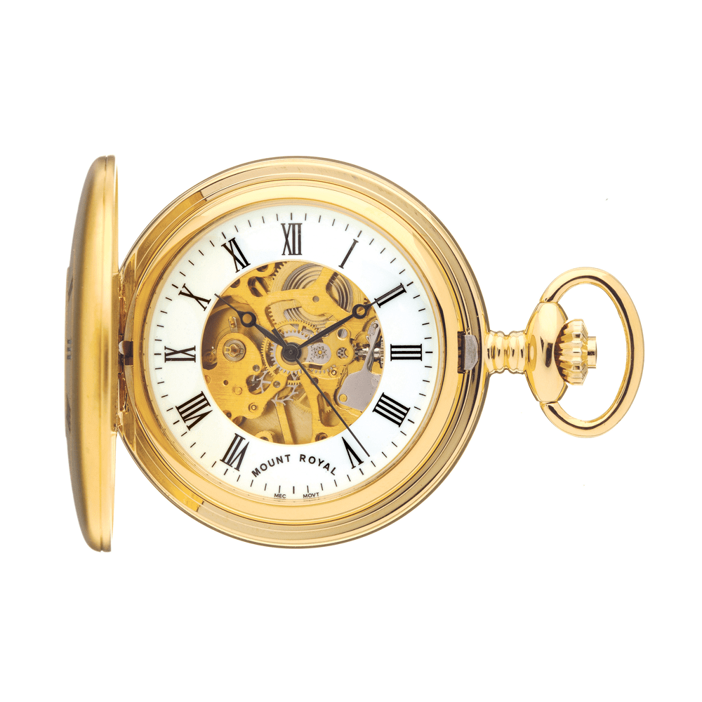 This Mount Royal Skeleton Pocket Watch is presented within a gold plated case complete with a satin finish. The watch features a 17 jewelled mechanical movement and classic skeleton white Roman dial.