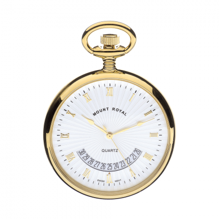 This stunning Mount Royal pocket watch features a quartz calendar movement and classic white Roman dial. The open face is surrounded by a gold plated case complete with a polished back.
