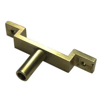 Cannon Pinion Bridge machined from 12mm x 12mm solid brass section. Fitted with a 9mm OD pipe extension for the hour wheel. Centre distance of the mounting holes 56.75mm.