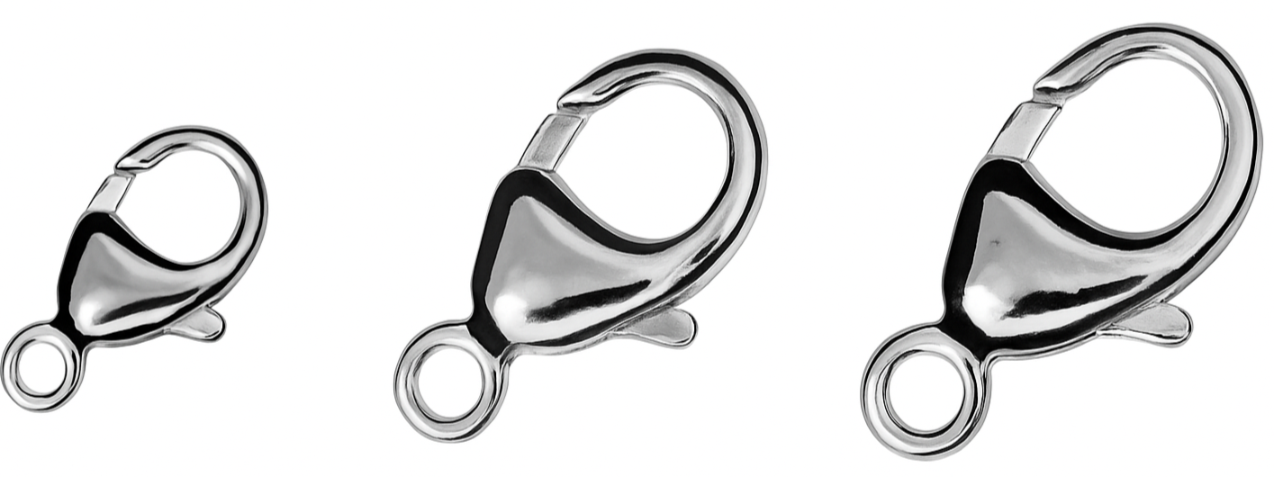 Sterling silver lobster catches in 9, 11, 13 & 16mm. Secure and durable clasps ideal for silver necklaces, bracelets, and jewellery repairs.